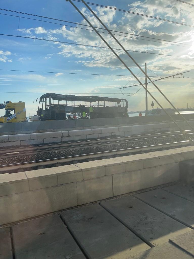 Friday, back to the train station for a trains to Venice, with a change in Ferrara. Our hotel was on main land Venice, so we dropped our bags, then headed back to the station for a train to Venice (lagoon). On the “causeway” there was the skeleton of a bus still on fire. Both sides of the road were closed, but the rail line was still open.