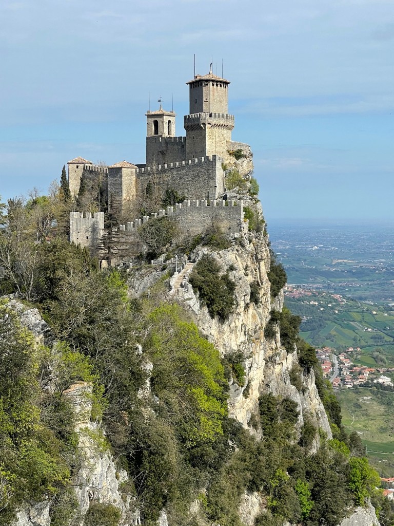 San Marino is Stunningly picturesque, the old town is a hill top castle with 3 towers, and views over rolling hills down to the sea in the distance. The photos do not do the place any justice. In the summer we are sure it will be mobbed by tourists, but apart from us, and what seems like the obligatory multiple school trips, the place was quite quiet.